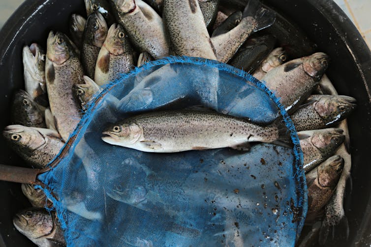 But this aquaculture as a whole is a net producer of marine ingredients. Carps – which make up by far the largest proportion of global aquaculture – are fed diets with little or no marine ingredients. Sometimes they are even cultured using no feed at all, instead relying on the natural productivity of ponds, encouraged by fertilisation. Advances in nutrition, together with a rising price, has also led to a decline in the levels of marine ingredients fed to salmon, with protein and oils replaced by vegetable substitutes such as soy and rapeseed oil.